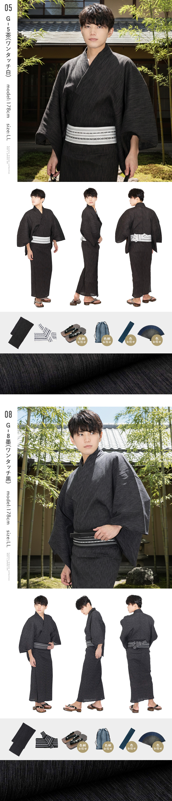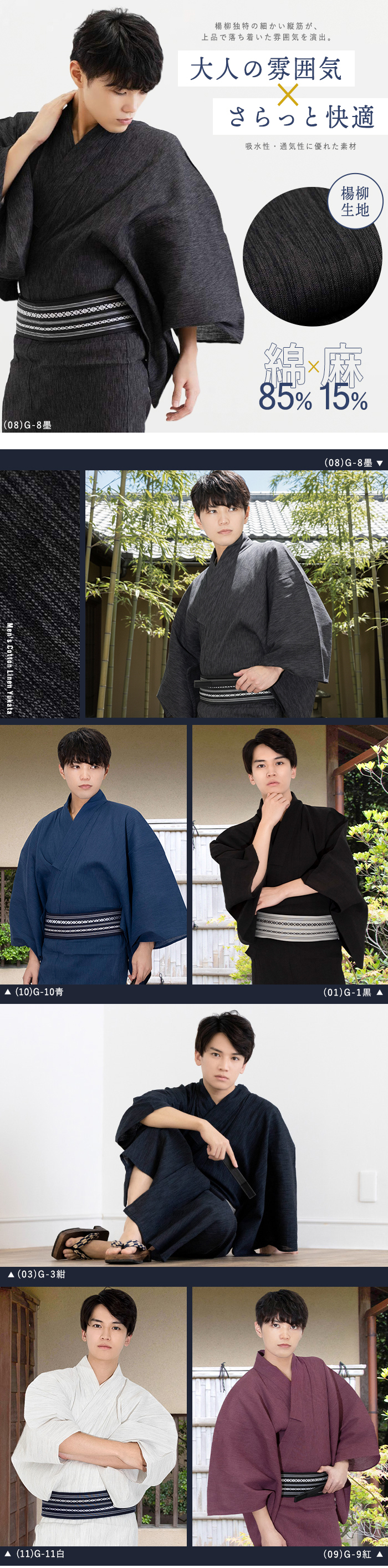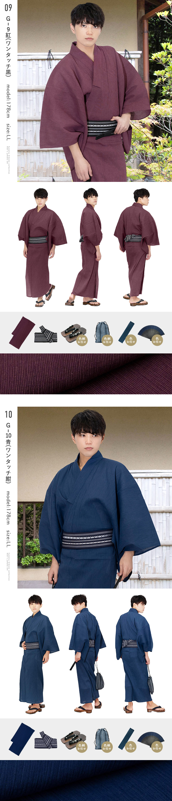 | 《いなせな夏》メンズ浴衣6点セット 綿麻楊柳シリーズ モデル着用のコーディネート通りの[浴衣]+[帯]+[下駄]+[腰紐]+[信玄袋]+[扇子]の6点セットをお届けします 楊柳ならではの極細のランダムな筋が特徴、 落ち着いた雰囲気ながら飽きのこない楊柳の縦縞がいなせな大人を演出します。 吸水性・通気性の良い綿麻生地を使用◎ 楊柳生地は体にくっつきにくく、べたつきにくく、盛夏にぴったりです。 《セット内容》 (1)【浴衣】お好きな色が選べます (2)【帯】モデル着用と同じ帯が付きます (3)【下駄】焼桐下駄 (鼻緒・台の色おまかせ) (4)【腰紐×1本】(色おまかせ) (5)【信玄袋】(色柄おまかせ) (6)【扇子】(色・骨おまかせ) ・2017年4月より浴衣サイズが変更になりました。 リピーター様はご注意下さい。 ■サイズ M(目安身長:165-170cm)/下駄:M(約26-27) L(目安身長:170-175cm) /下駄:L(約27-28) LL(目安身長:175-180cm)/下駄:L(約27-28) 3L(目安身長180-185cm)/下駄:LL(約28-29) ※セット商品のため下駄のサイズはお選びいただけません。 ■素材 浴衣:綿85% 麻15% ワンタッチ角帯:ポリエステル100% 下駄:鼻緒ポリエステル100%/台桐(焼き台) 腰紐:ポリエステル100% 信玄袋:綿、麻、ポリエステル等 扇子:骨:竹/布部分:正絹100% ■生産国 中国製 ■配送 宅配便 |