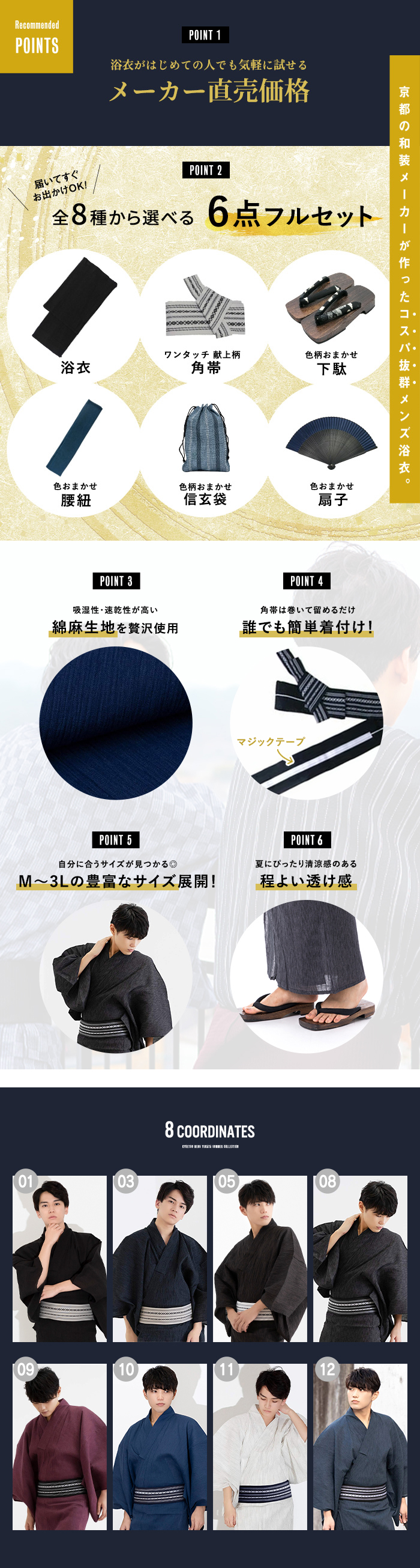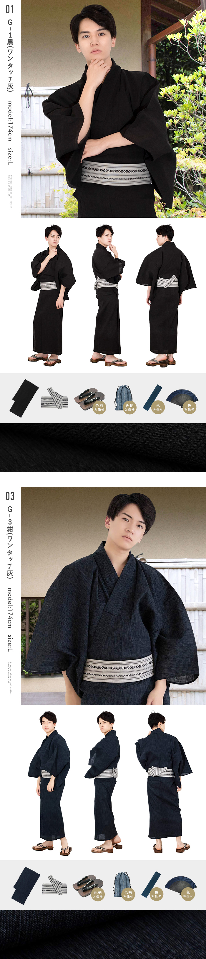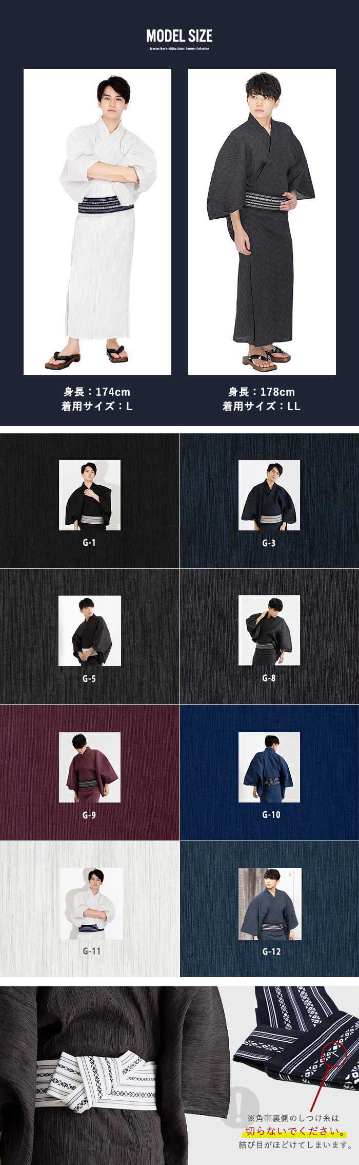 | 《いなせな夏》メンズ浴衣6点セット 綿麻楊柳シリーズ モデル着用のコーディネート通りの[浴衣]+[帯]+[下駄]+[腰紐]+[信玄袋]+[扇子]の6点セットをお届けします 楊柳ならではの極細のランダムな筋が特徴、 落ち着いた雰囲気ながら飽きのこない楊柳の縦縞がいなせな大人を演出します。 吸水性・通気性の良い綿麻生地を使用◎ 楊柳生地は体にくっつきにくく、べたつきにくく、盛夏にぴったりです。 《セット内容》 (1)【浴衣】お好きな色が選べます (2)【帯】モデル着用と同じ帯が付きます (3)【下駄】焼桐下駄 (鼻緒・台の色おまかせ) (4)【腰紐×1本】(色おまかせ) (5)【信玄袋】(色柄おまかせ) (6)【扇子】(色・骨おまかせ) ・2017年4月より浴衣サイズが変更になりました。 リピーター様はご注意下さい。 ■サイズ M(目安身長:165-170cm)/下駄:M(約26-27) L(目安身長:170-175cm) /下駄:L(約27-28) LL(目安身長:175-180cm)/下駄:L(約27-28) 3L(目安身長180-185cm)/下駄:LL(約28-29) ※セット商品のため下駄のサイズはお選びいただけません。 ■素材 浴衣:綿85% 麻15% ワンタッチ角帯:ポリエステル100% 下駄:鼻緒ポリエステル100%/台桐(焼き台) 腰紐:ポリエステル100% 信玄袋:綿、麻、ポリエステル等 扇子:骨:竹/布部分:正絹100% ■生産国 中国製 ■配送 宅配便 |