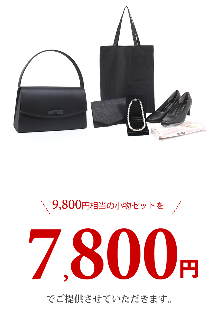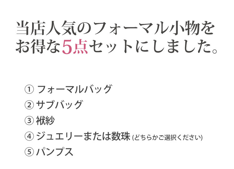 フォーマルバッグ・サブバッグ・袱紗・ジュエリーまたは数珠どちらか・パンプス(21.0〜26.0cm)