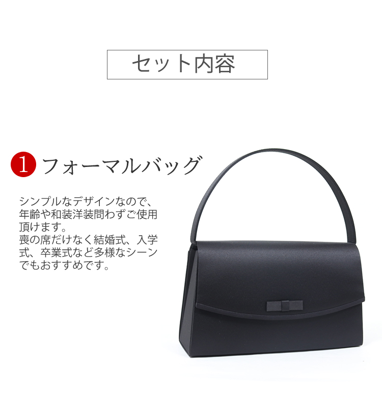 また、こちらの小物は葬儀や法事などの喪の席だけでなくバッグ、パンプスは結婚式やパーティーなど華やかな席の他、卒業式や卒園式、お受験など様々なフォーマルシーンでご使用いただけます。