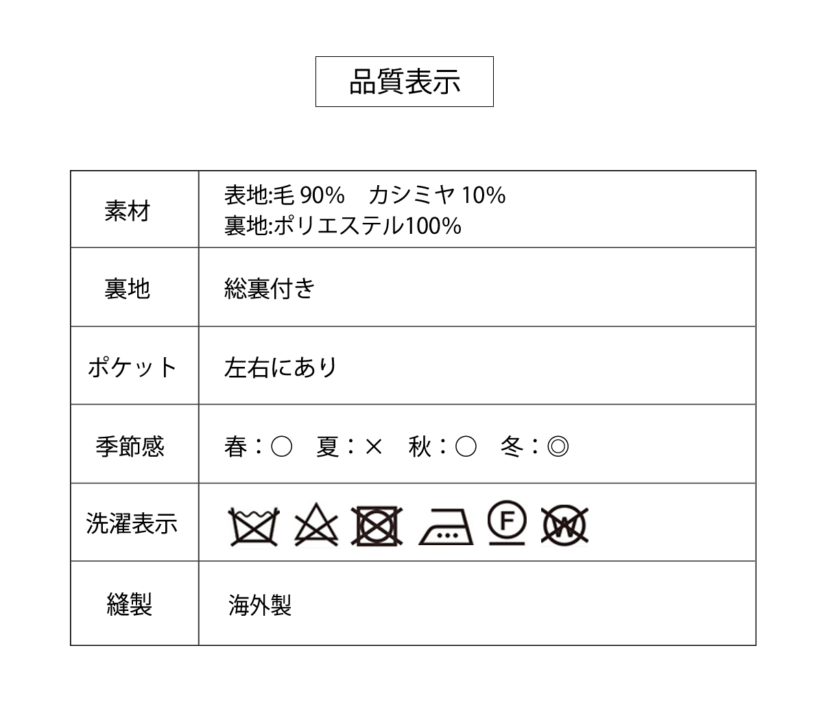 表地:カシミヤ10% 毛90% 裏地:ポリエステル100%