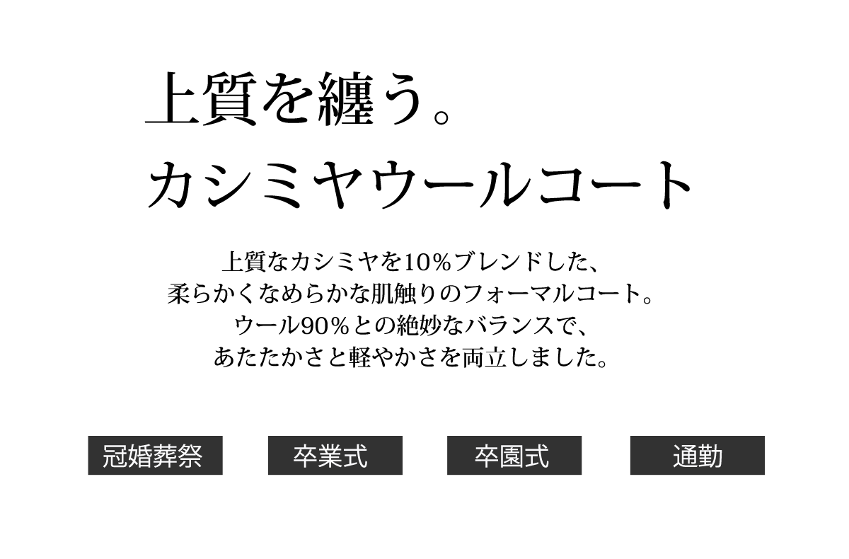繊度がきわめて細く柔軟性に富みぬくもりのある手ざわりを持つカシミヤ混の上質なウール素材で、しなやかな艶と高級感をまとったフォーマルコート。
