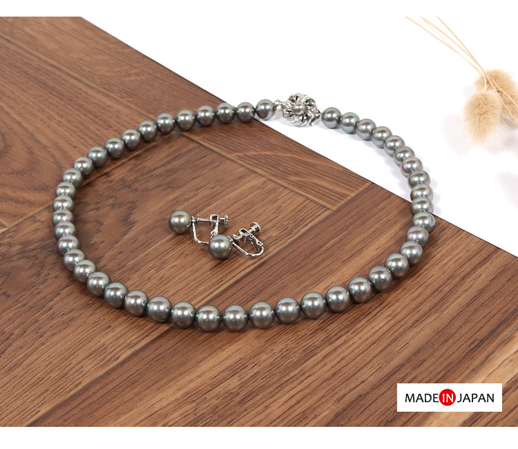パール ネックレス 貝パール 真珠 イヤリングセット ピアス フォーマル 冠婚葬祭 葬儀 法事 ブラックフォーマル 喪服 日本製 グレー 8mm