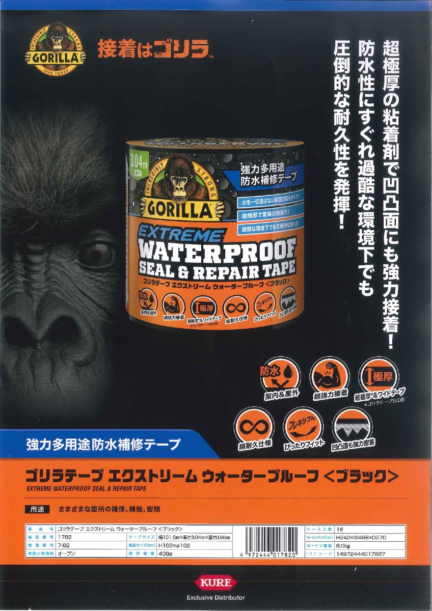 ゴリラテープ エクストリーム ウォータープルーフ(ブラック) 品番1782(日本総代理店:呉工業)