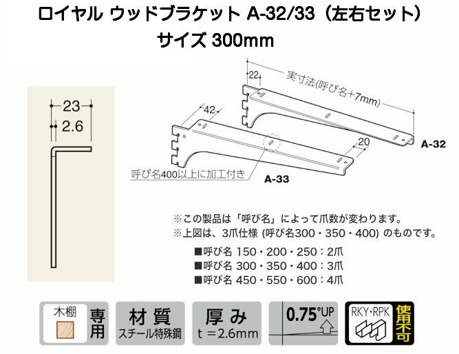 ROYALロイヤルの木棚板用水平ブラケットA-32/A-33左右セットです。