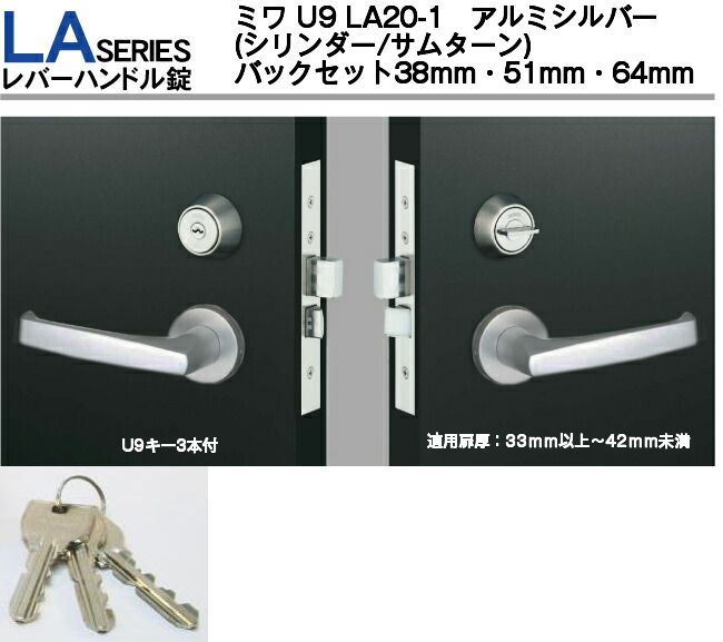 MIWA ミワ U9 LA20-1 SV(アルミシルバー)適用扉厚33〜42mm 美和ロックLAレバーハンドル錠(バックセット38/51/64mm)外シリンダー・内サムターンタイプ