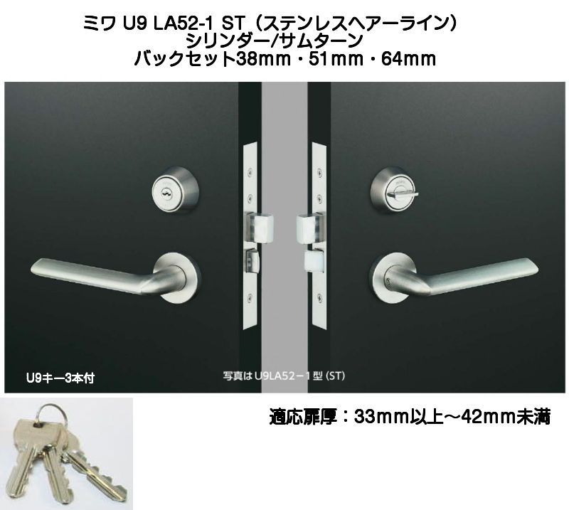 MIWA ミワ U9 LA52-1 ST(ステンレスヘアーライン)適用扉厚33〜42mm 美和ロックLAレバーハンドル錠(バックセット38/51/64mm)外シリンダー・内サムターンタイプ