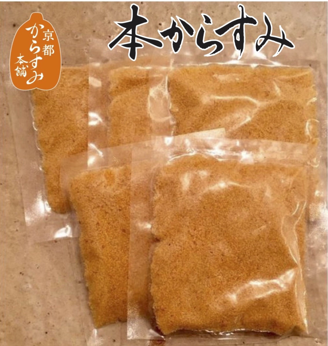 からすみパウダー(1袋約18gを1パック)と、そのままでもパスタのトッピングにでもお楽しみいただける、切り身(約10g)のセットになります