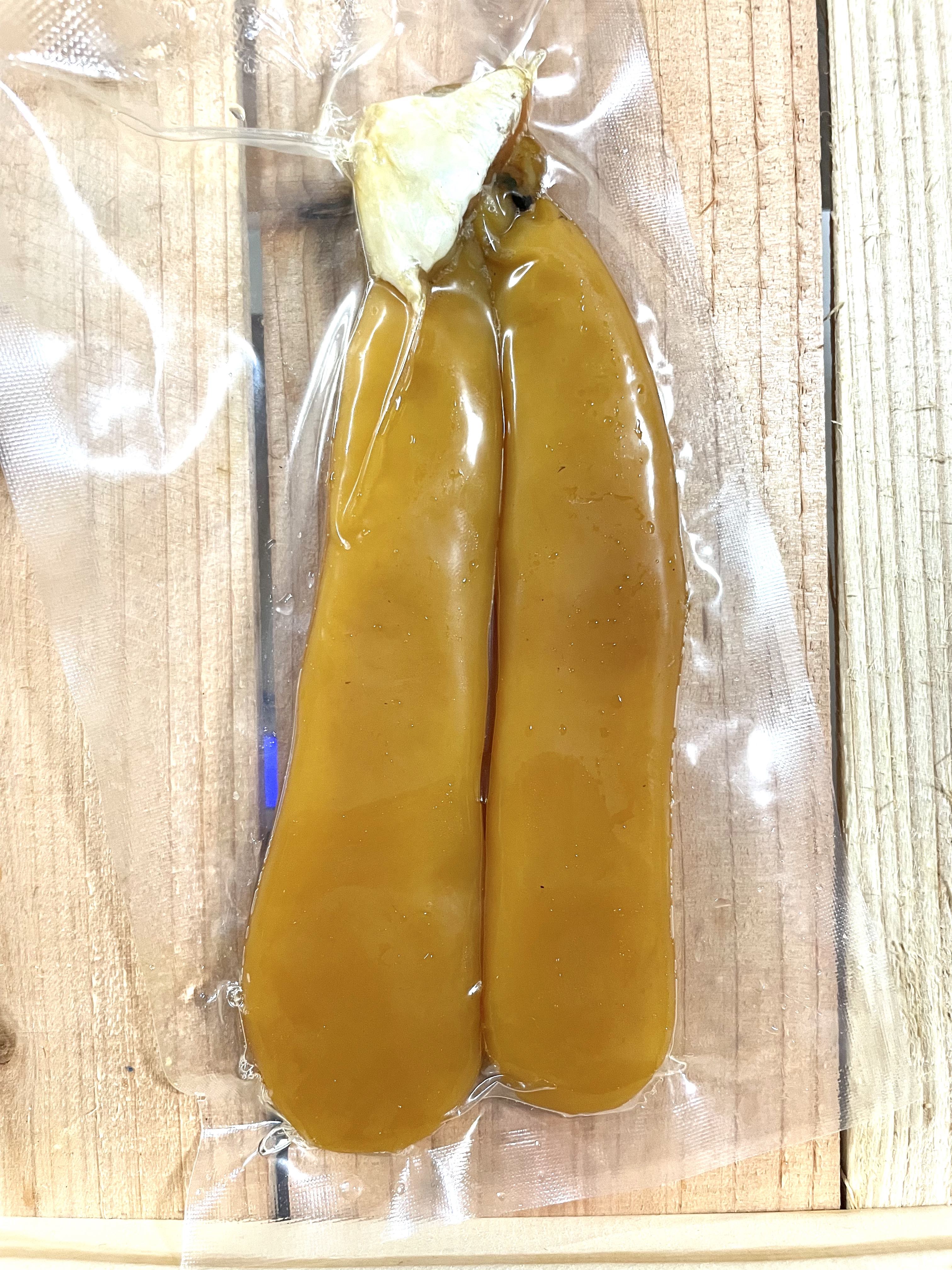原料のボラの子は兵庫県家島産のボラの卵巣で作った本からすみ、純国産品です