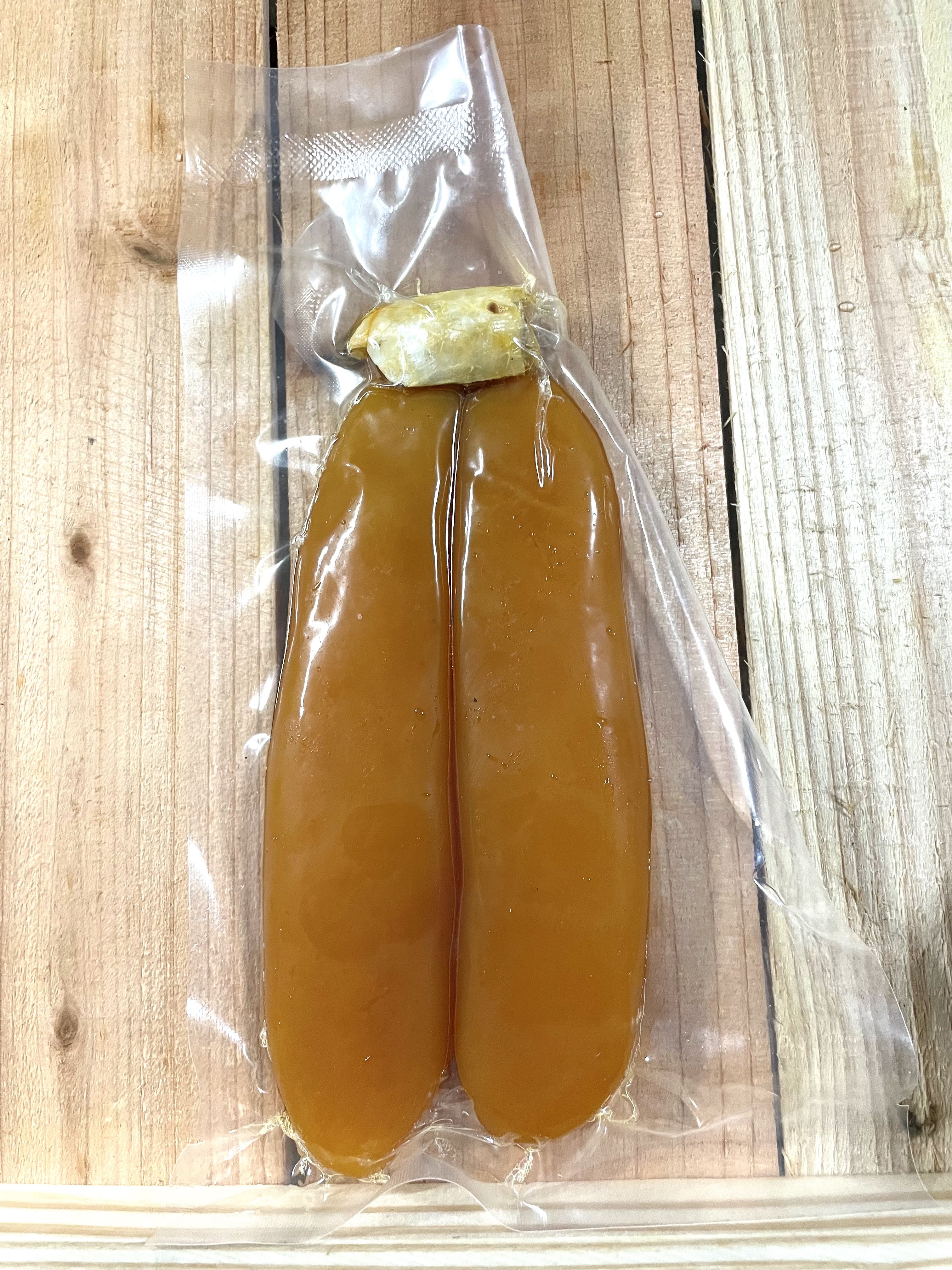 塩と焼酎、酒以外は使用されておらず、着色料や保存料などの化学調味料は使用されていない無添加、無着色の本からすみです。