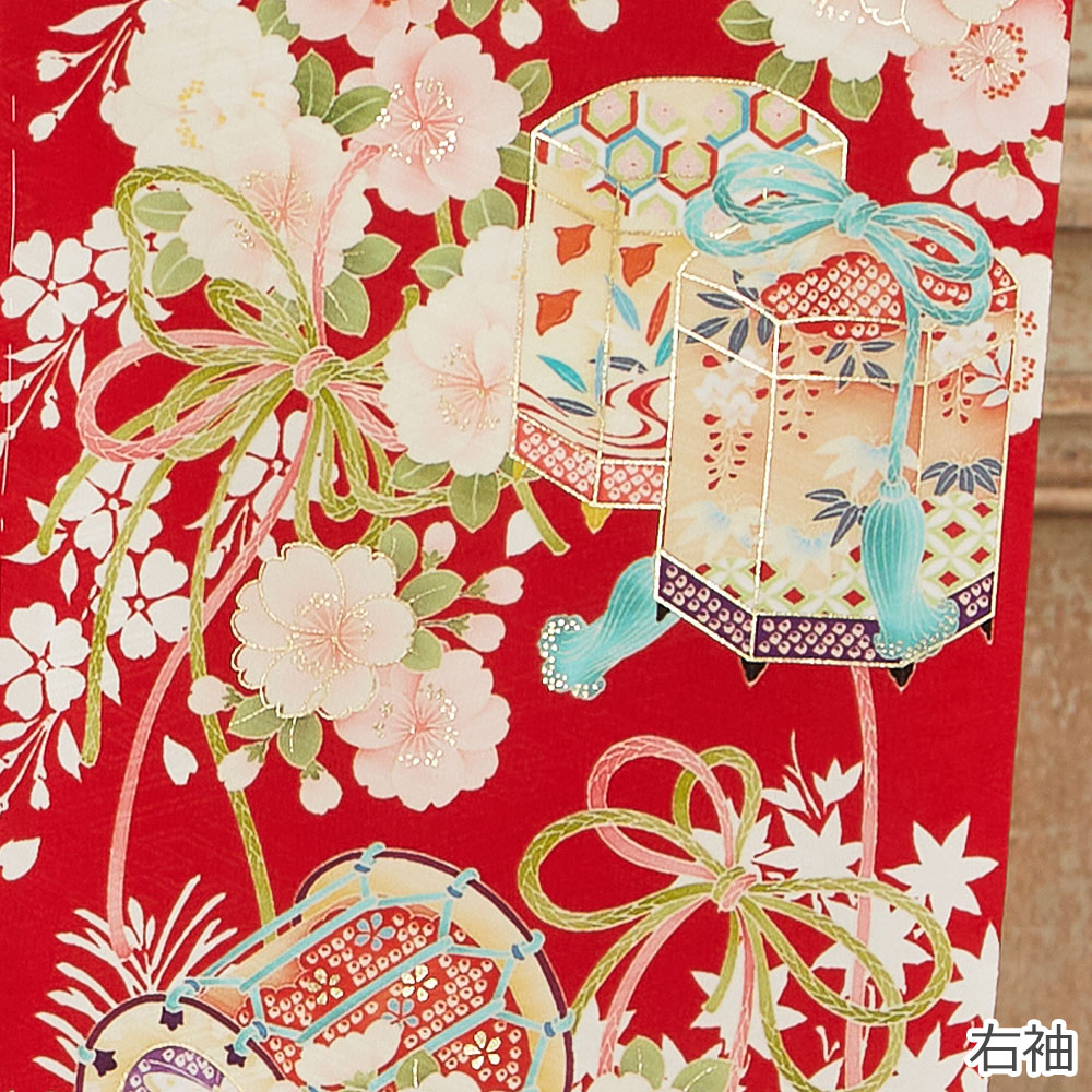 定番の赤い着物に、桜・貝桶などの柄をあしらった華やかなデザインです。