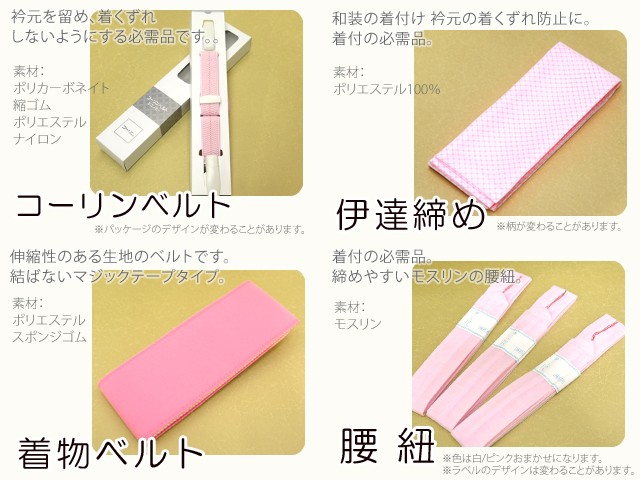 | 素材 | 着物ベルト/ポリエステル他 伊達締め/ポリエステル 腰紐/モスリン コーリンベルト/カーボネイト他 |