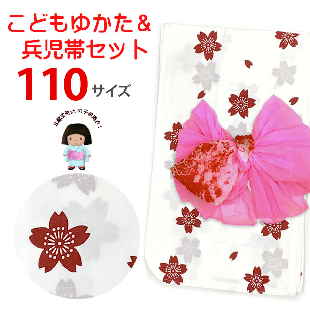 京都室町st. 女の子 キッズ浴衣 兵児帯 セット 110サイズ こどもゆかた レトロ シンプル柄「白系、桜」OGY25-11-54setTc