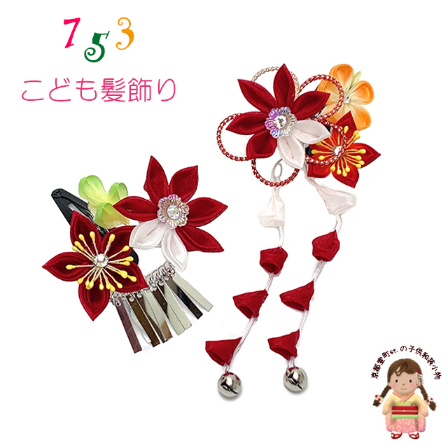 京都室町st. 七五三 髪飾り 子供髪飾り スリーピン パッチン留めの摘み花髪飾り 2点セット「紅白、剣先摘み花」OKKM683