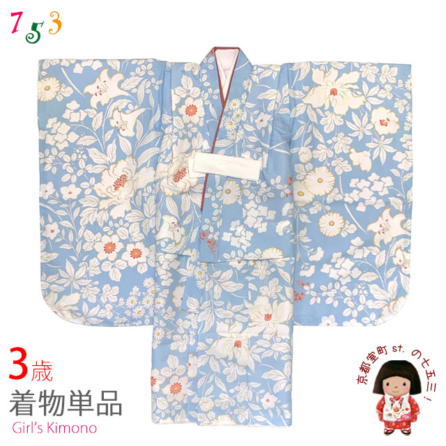 京都室町st. 七五三 3歳 着物 女の子 身上げ・肩揚げ加工済み 襦袢付き 三つ身の着物 単品「水色、百華」TY3K-2tan