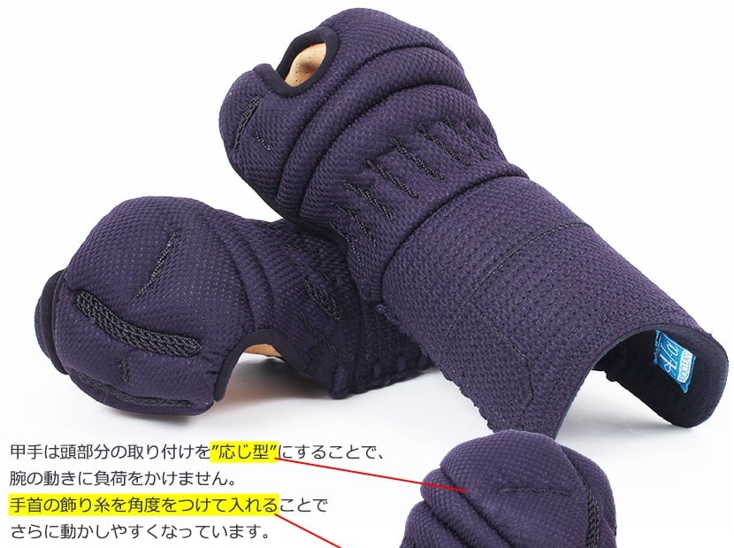 | 甲手 | ・バイオクリーンシルリード 筒内に優れた吸汗性と通気性を兼ね備えた素材を採用。吸い取った汗を素早く発散。 (肌合いの良い素材は)汗をかいてもベトつきにくく、長く快適な状態を保ちます。 ・ミクロパンチクラリーノ革 素材に開けられた通気孔が通気性を高め、小手内の快適性を高めます。 |