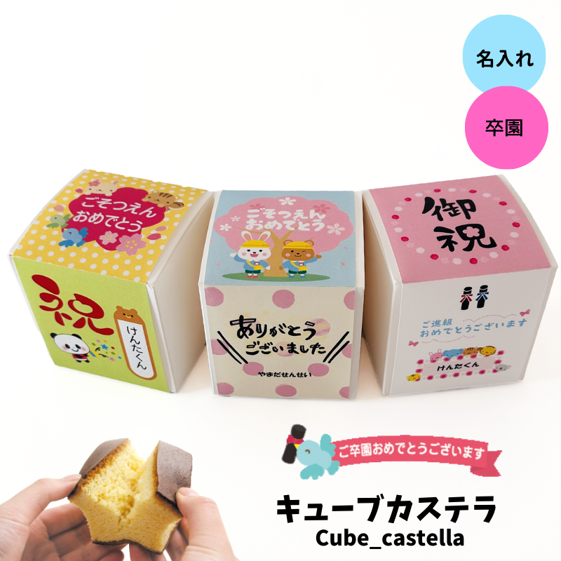 [簡単オーダー] 卒園 名入れ キューブ カステラ プレーン 【京都三源庵】ギフト プレゼント お祝い ばらまき 記念品 お菓子