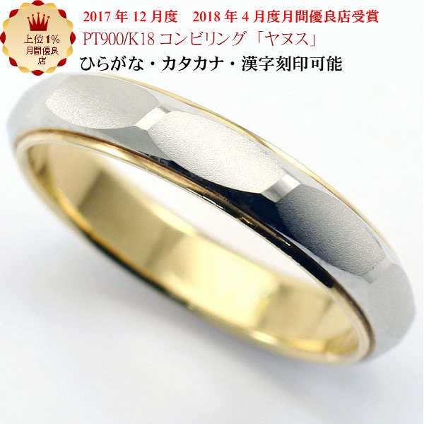 そのプラチナにK18イエローゴールドの華やかさをプラスしたコンビリングです。幅約3.4mmのK18リングの上に、波の様に連続した模様が施されたプラチナが入っています。プラチナの模様表面は落ち着いたつや消し仕上げ。プラチナの一番高くなっている部分とサイドの部分、またK18の部分は鏡面磨き仕上げとなっております。輝きの対比がとても華やかで美しいリングです。コーディネートもしやすく、シンプルなので永くご愛用頂けます