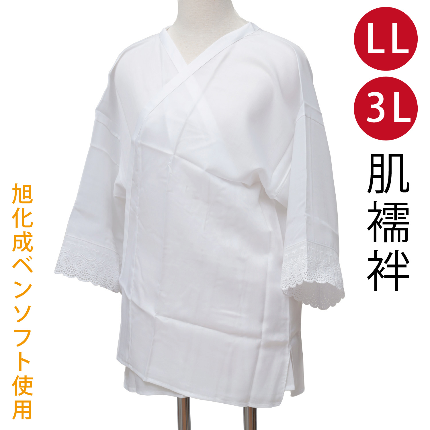 旭化成の高品質合成繊維『ベンソフト(キュプラ)』素材の和装用肌襦袢、レディース、女性用です。上半身の肌襦袢タイプです。ふくよかな方、ぽっちゃりな方向きの大きめサイズとなっております。