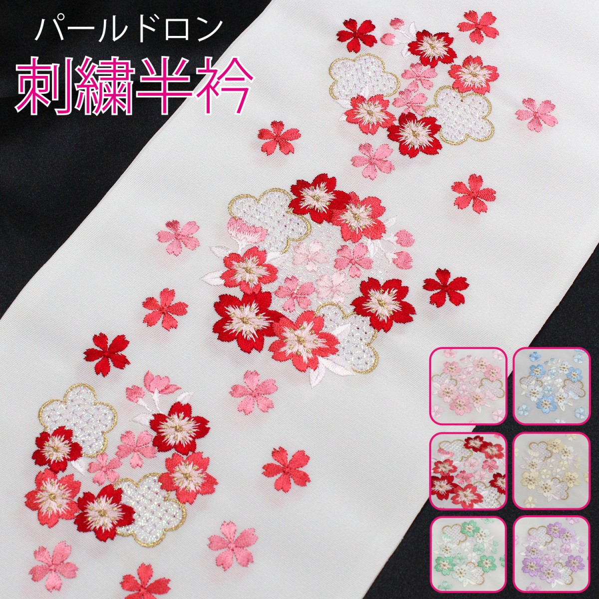 振袖、袴、小紋などにおすすめの刺繍半衿です。きらきら光るパールドロン刺繍です。刺繍の柄は桜と梅がモチーフになっています。カラーバリエーションは全部で6色です。その日の気分や、着物の色柄に合わせてお選びいただけます。追跡サービス付きのポスト投函型のメール便にて全国一律送料無料でお届けいたします。