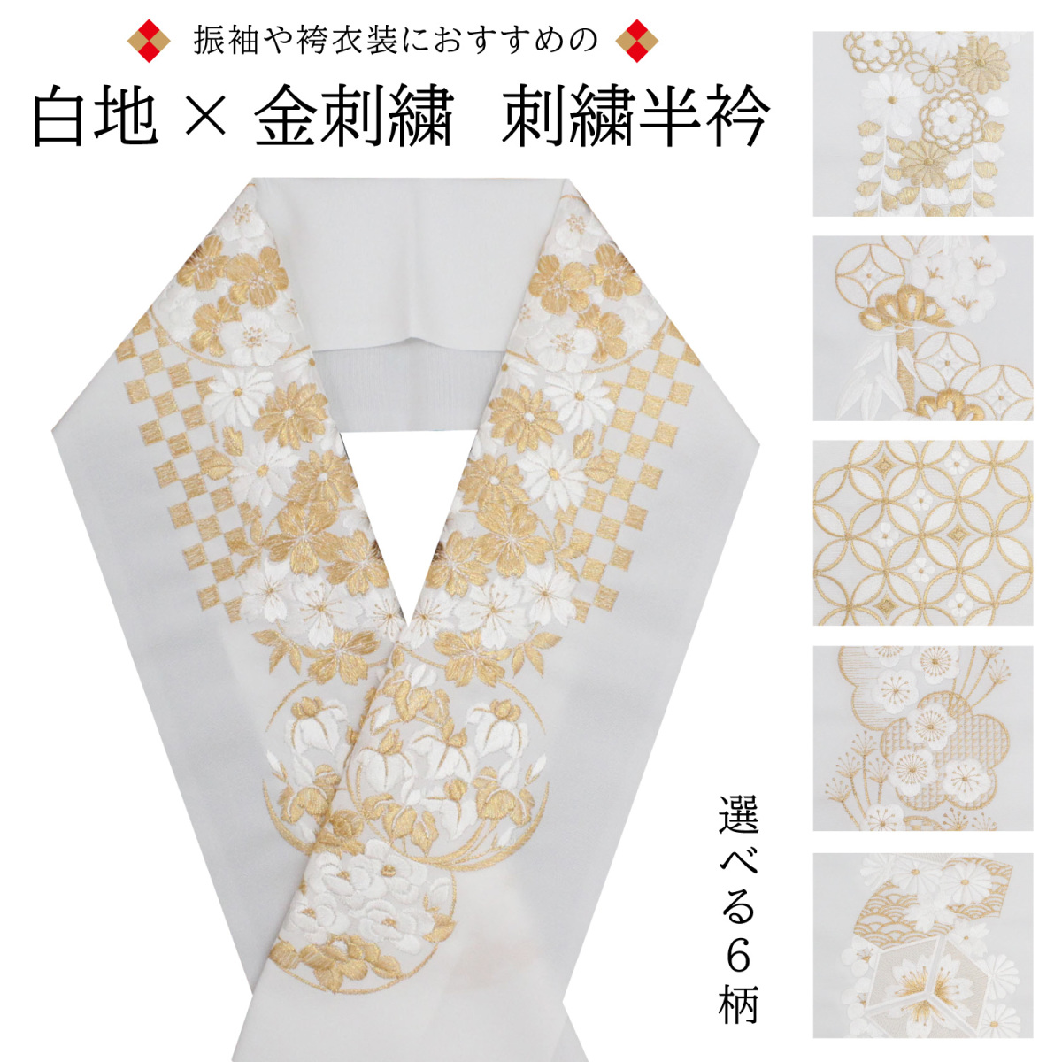 半衿 刺繍 白地 金 半襟 振袖用 袴用 成人式 卒業式 結婚式 ゴールド 古典柄 刺繍襟 洗える 大人 女性 レディース ポリエステル