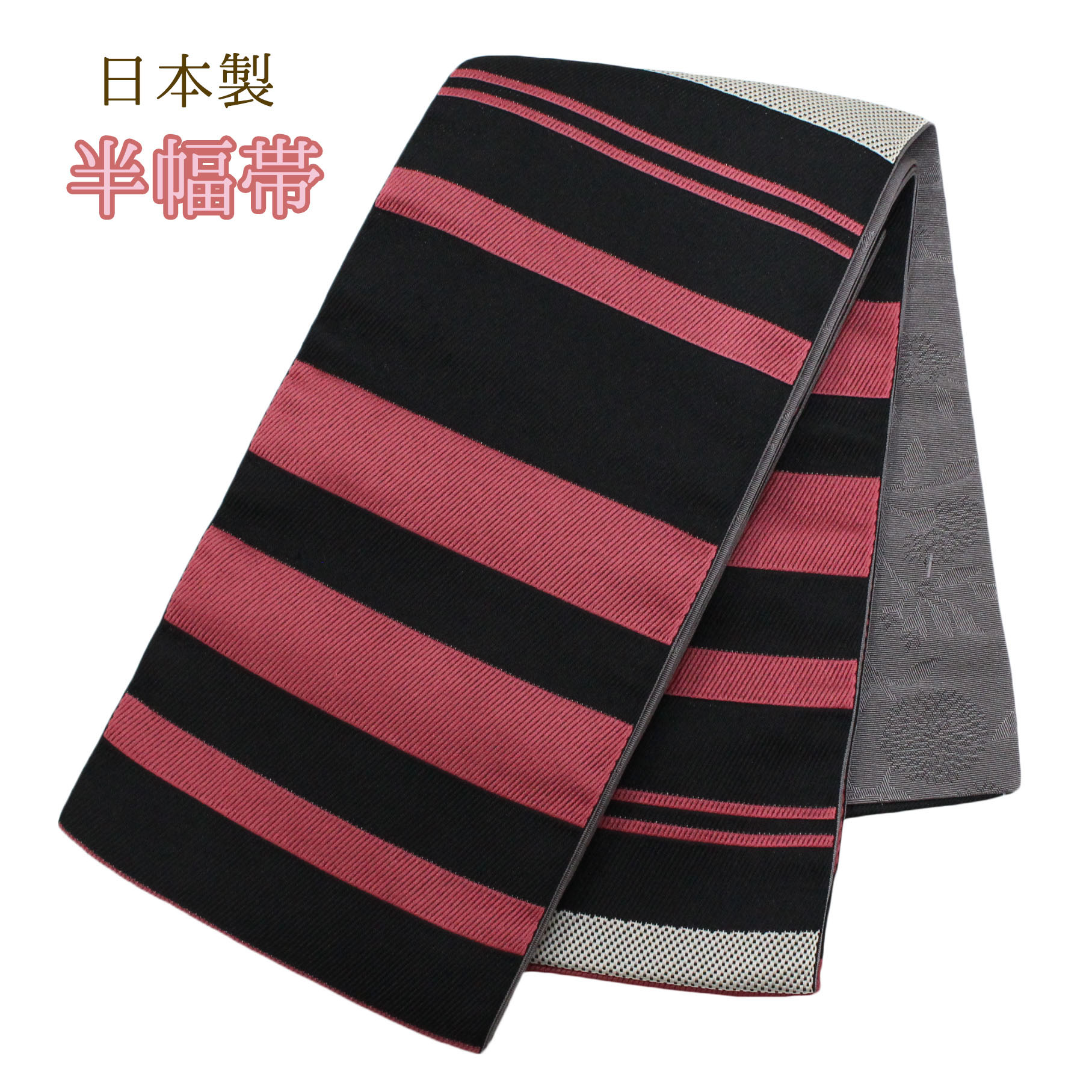 半巾帯 半幅帯 浴衣帯 浴衣 ゆかた 小紋 紬 洗える着物 カジュアル ポリエステル 黒 赤 グレー 縞 縦縞 ボーダー ストライプ リバーシブル 日本製 母の日