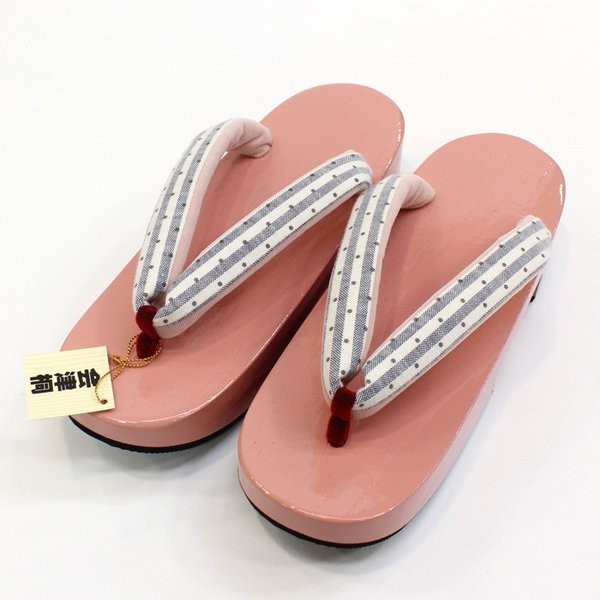高級草履・下駄の老舗メーカー、みゆき本舗の桐下駄です。国産会津桐の台をポップなかわいいピンクに塗り、ストライプとドットの鼻緒がすげられています。夏のお洒落な着物や浴衣におすすめの品です。