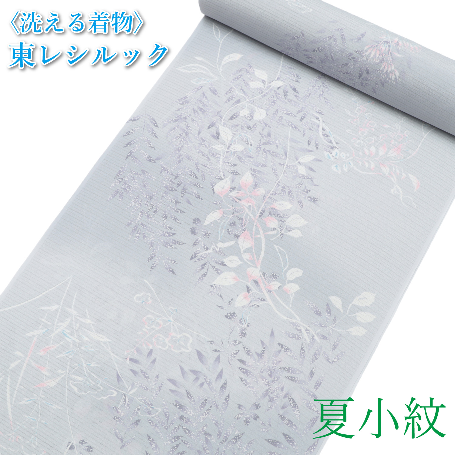 東レシルック素材の洗える夏着物です。東レシルックは、東レが開発したポリエステルの合成繊維で、絹のようにしなやかで優雅な光沢と合繊のもつ機能性を兼ね備えた最高級織物です。手触りも非常に柔らかく体に沿いやすい生地です。また、家庭で洗濯できるので着付け教室のお稽古着や踊りや舞台の練習で汗をかいても安心です。