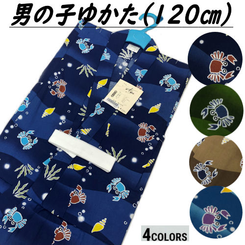 ゆかた こども サイズ120 紺 茶 緑 青 浴衣 男の子 蟹柄 カニ柄 キッズサイズ 7才から8才用 120cm 男児 子供 綿 ジュニア レトロ 新品 子供ゆかた