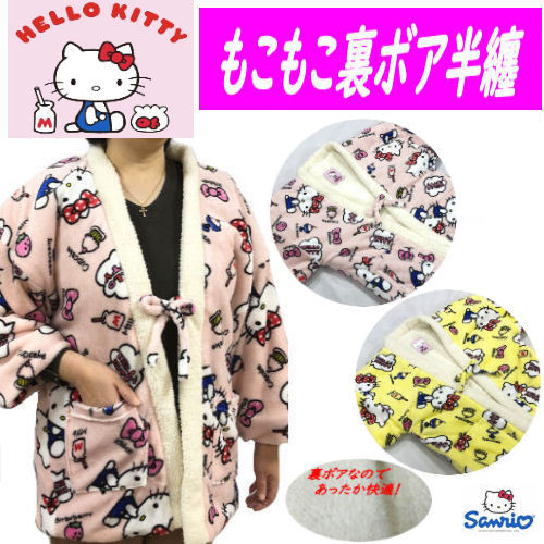 もこもこ半纏 ハローキティ 婦人用 半纏 フランネル 裏ボア 防寒 袖あり フリーサイズ 袢纏 半てん 袢天 レディース おしゃれ Sanrio サンリオ