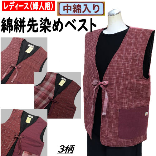 和柄ベスト 綿絣 先染め 中綿入り ベスト 65cm丈 前縛り 柄切替 アシンメトリー 和柄 レディース 袖なし 3色 両サイドポケット 快適 ML 婦人 赤 ぽんちょ