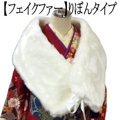 フェイクファーストール ホワイト 両面 リボンタイプ 白 ショール 振袖用 ポリエステル 和装小物 ストール 和服 レディース 着物 成人式 箱なし