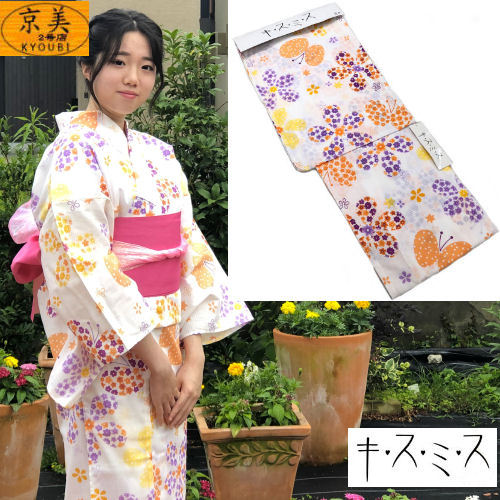 浴衣 レディース キスミス 白 オレンジ ブランド浴衣 蝶々 お仕立て上がり 紅梅織り 女性用 フリーサイズ ゆかた 単品 綿100% 花柄