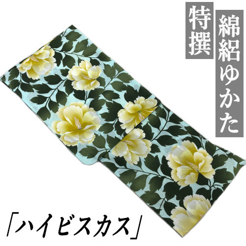 ゆかた モダン 「ハイビスカス」 綿絽ゆかた 先染め 和風 浴衣 古典柄 ブルー グリーン 仕立て上がり レトロモダン 綿絽浴衣 大人 手書き風 レディース 単品