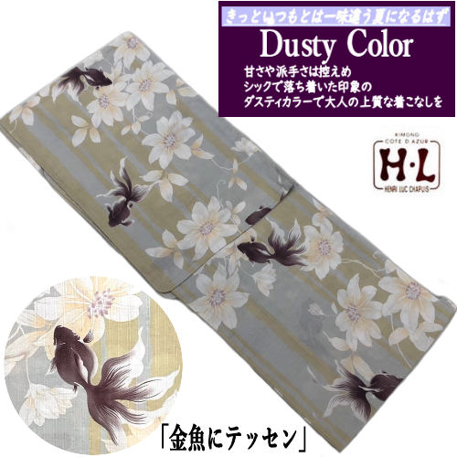 ゆかた HL アッシュエル 金魚にテッセン 淡いグレー ダスティカラー 綿ゆかた きんぎょ クレマチス 浴衣 古典柄 仕立て上がり 大人 新柄 大正浪漫 くすみ色