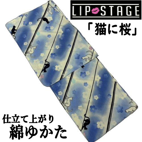 ゆかた 「猫に桜」 白地に青 リップステージ 浴衣 古典柄 仕立て上がり ねこ ネコ フリーサイズ 綿浴衣 変り透かし織 レディース 綿100% プレタ ブランド浴衣