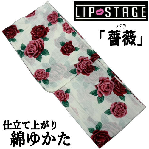 ゆかた 「薔薇」 白地に赤 リップステージ 浴衣 古典柄 仕立て上がり バラ 薔薇 フリーサイズ 綿浴衣 変り透かし織 レディース 綿100% プレタ ブランド浴衣