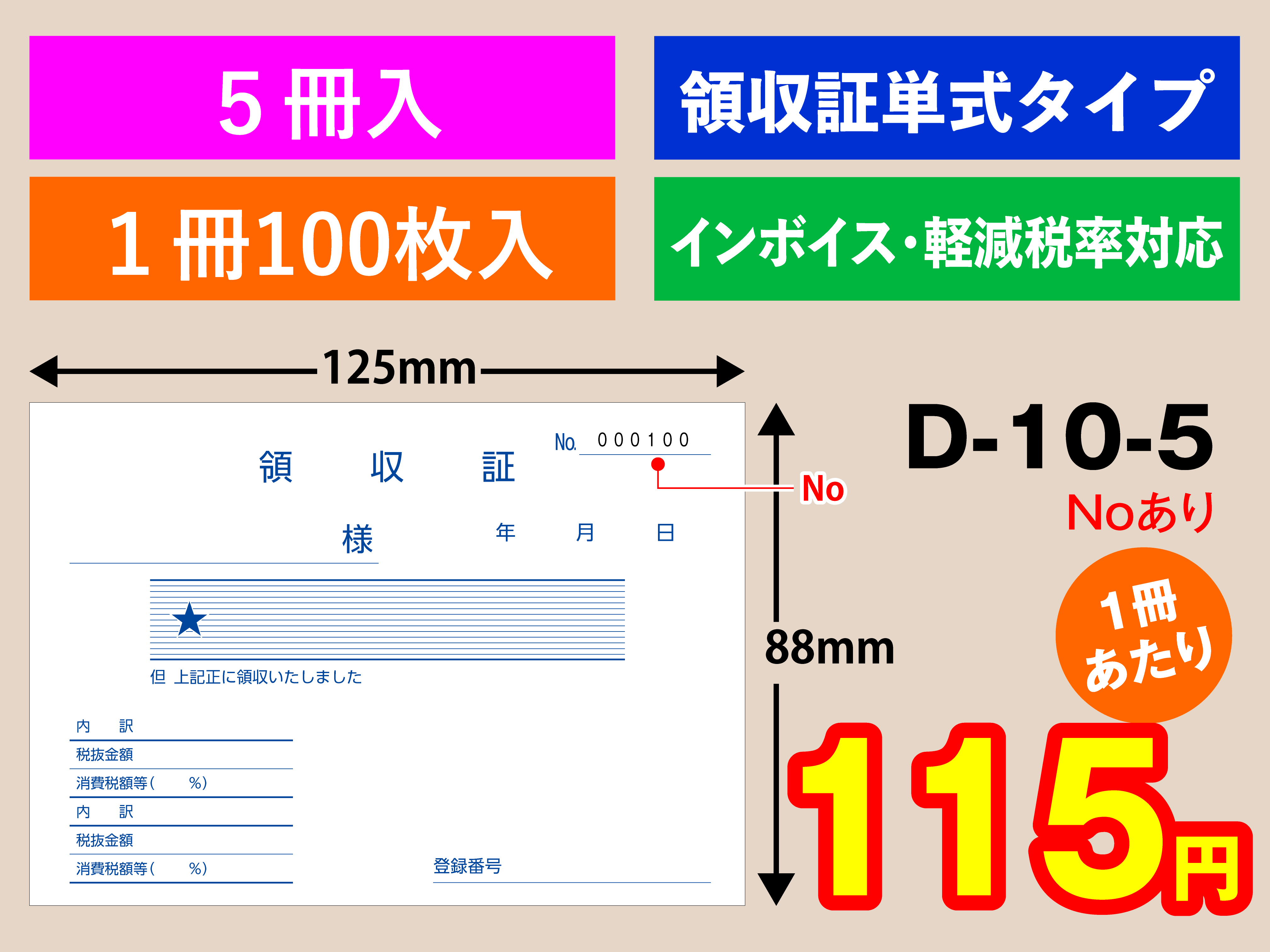 ●領収書 ●領収証 ●寸法:横125×縦88ミリ ●1冊 100枚入り