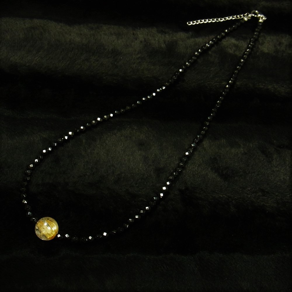 ゴールドタイチンルチルとカットオニキスを組み合わせたデザインネックレスで、
