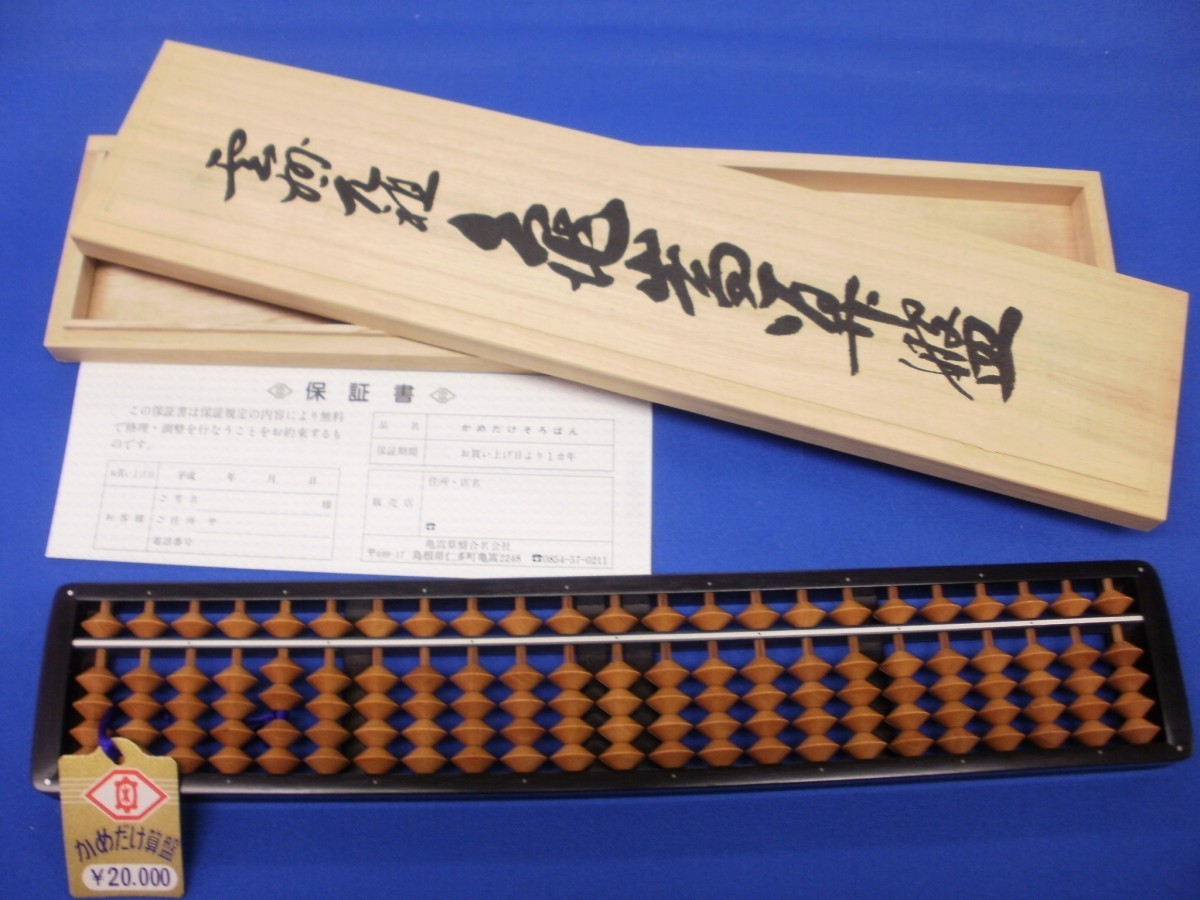 桁数・玉数 23桁4玉 製品寸法 332×64.5×18.5 枠の素材 アフリカ黒檀 玉の種類 カバ玉 中桁の素材 積層強化木 芯竹の種類 煤竹 裏棒の素材 アフリカ黒檀 脇棒の素材 アフリカ黒檀 ボタンの有無 ー ボタンの種類 ー 枠の形状 丸み加工 裏棒の形状 平型 枠の塗装法 蝋引き 大正11年創立の老舗算盤メーカー亀嵩算盤。奥出雲の地でそろばん作りを続けています。 算盤のお手入れ:柔らかい布巾でそろばんを乾拭きされることをお勧めします。 布巾をそろばんの盤面に乗せ、床拭きの要領で左右に動かします。 玉を転がすようにしますが、合わせて上下枠のくぼみの汚れもふき取るようにするとなお良いです。 玉穴に入ったホコリや枠の軽微な汚れはこれで綺麗になります。