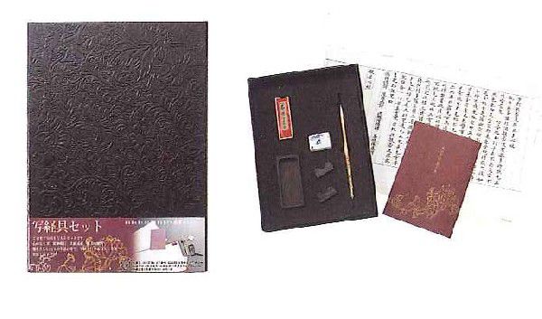 写経筆1本、墨1丁、硯1面、写経用紙(楮紙(白))15枚、お手本1枚、罫線入り下敷き(紙製)1枚、文鎮2個、水差し1個、写経のしおり1冊をセット。