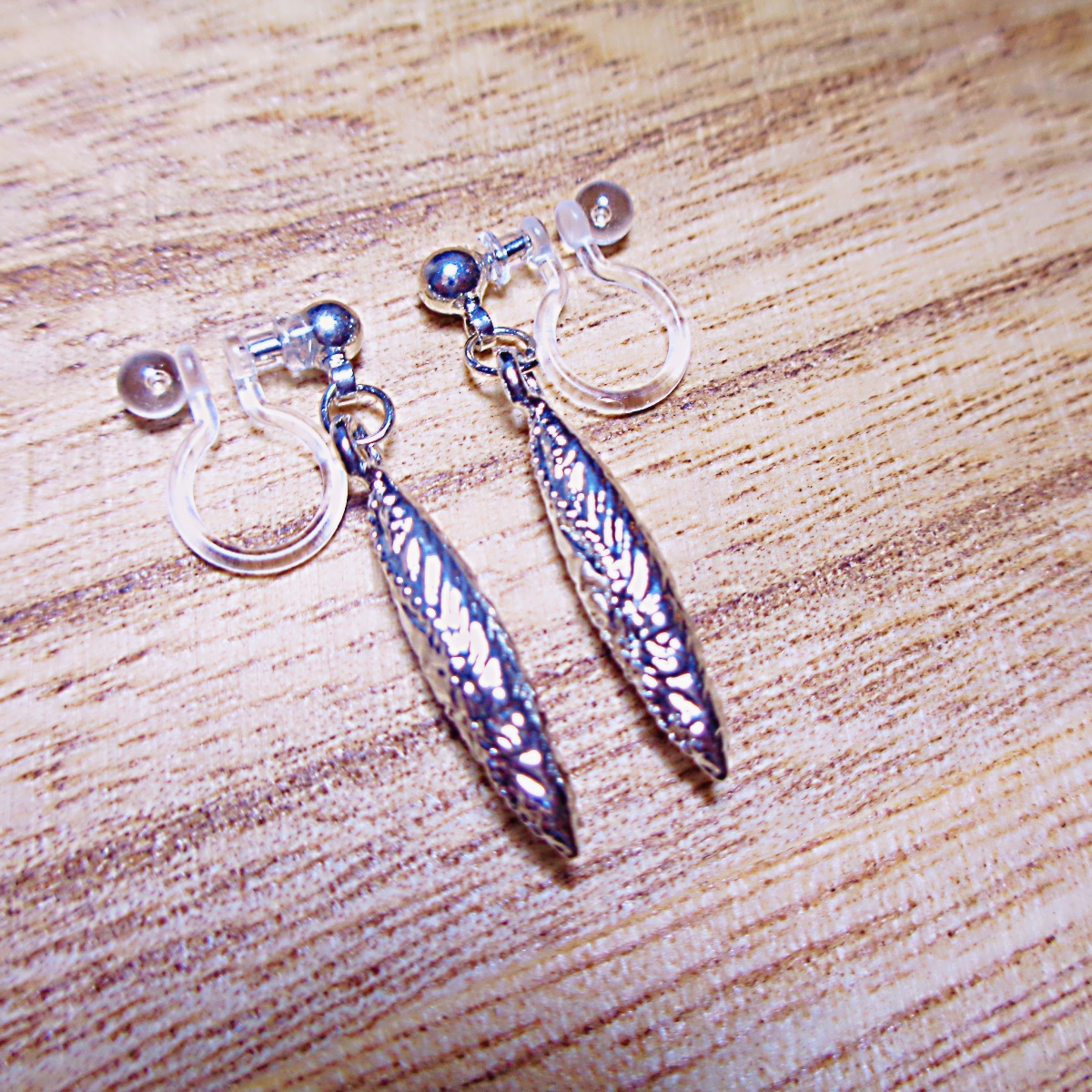 細いメタルパーツの樹脂ノンホールピアスです。