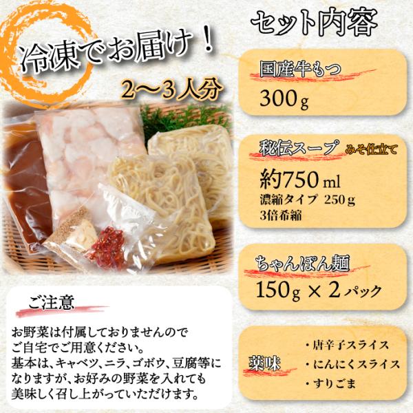 ■内容:国産牛小腸300g、みそスープ250g(濃縮タイプ)、ちゃんぽん麺150g×2パック、唐辛子スライス、にんにくスライス、すりごま
