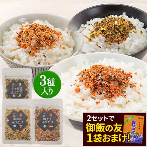 | 原材料 | 【車海老】 豚骨風味顆粒(乳糖、チキンエキス、コーンスターチ、食塩、砂糖、香辛料、ポークエキス、ホタテエキス)(国内製造)、白ごま、乳糖、砂糖、車海老、食塩、でん粉、のり、削節(さば、かつお)、しょうゆ、車海老粉末、酵母エキス、小麦胚芽、たんぱく加水分解物、発酵調味料、香辛料/調味料(アミノ酸等)、着色料(カラメル、カロテノイド)、甘味料(甘草、スクラロース)、酸味料、(一部にえび・小麦・乳成分・ごま・大豆・鶏肉・豚肉・ゼラチンを含む) 【辛子明太子】 辛子明太子加工品(国内製造)、白ごま、でん粉、唐辛子、粒状大豆たんぱく、食塩、乳糖、とろろ昆布(昆布、醸造酢)、のり、砂糖、粉末水飴、しょうゆ、かつお削節、たんぱく加水分解物、昆布粉末、かつお粉末、酵母エキス、魚醤、かつおエキス、昆布エキス、生姜/加工でん粉、調味料、(アミノ酸等)、着色料(紅麹、カロテノイド)、甘味料(ソルビトール、甘草)、酒精、香料、酸化防止剤(V.C)、ナイアシン、発色剤(亜硝酸Na)、(一部に小麦・乳成分・ごま・大豆・ゼラチンを含む) 【辛子高菜】 いりごま(国内製造)、乾燥高菜漬(高菜、ごま油、還元水飴、食塩、乳糖、でん粉分解物、唐辛子)、でん粉、刻み昆布(昆布、醸造酢、砂糖、ブドウ糖果糖液糖、食塩)、砂糖、食塩、しょうゆ、発酵調味料、青のり、かつお削節、たんぱく加水分解物、昆布エキス、マルトデキストリン、かつお節粉末、唐辛子/調味料(アミノ酸等)、甘味料(ソルビット、甘草、ステビア)、着色料(カロテノイド、ウコン)、香辛料抽出物、酸味料、(一部に小麦・乳成分・ごま・大豆を含む) |