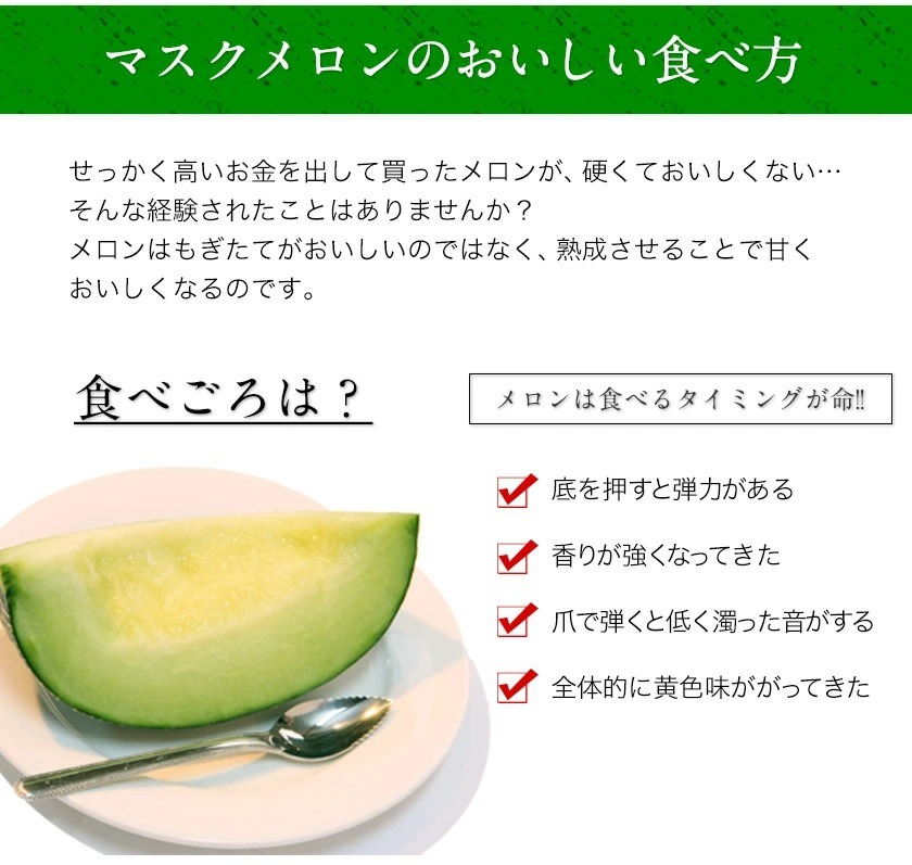 メロンのお尻(底部)を軽く押してみて弾力を感じたら食べごろです。