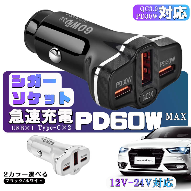 シガーソケット 車載充電器 カーチャージャー 充電 QC3.0 PD30W 急速充電 USB 増設12V 24V 車用 急速 カーチャージャー 車 便利グッズ USB TYPE-C