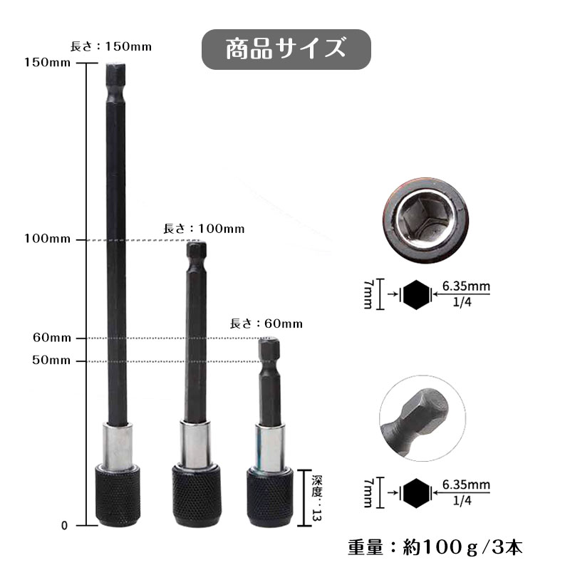 エクステンションバー ドリル 六角軸 延長 ロッド ドリルビット 3サイズ 60mm 100mm 150mm ドリルビット用 延長バー ドリル延長棒