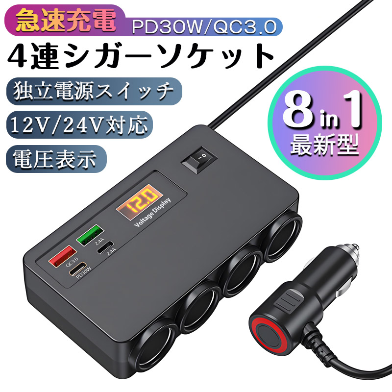 シガーソケット 増設 4連 車載充電器 カーチャージャー 充電 QC3.0 PD30W 急速充電 USB 増設12V 24V 車用 急速 カーチャージャー 車 便利グッズ USB TYPE-C
