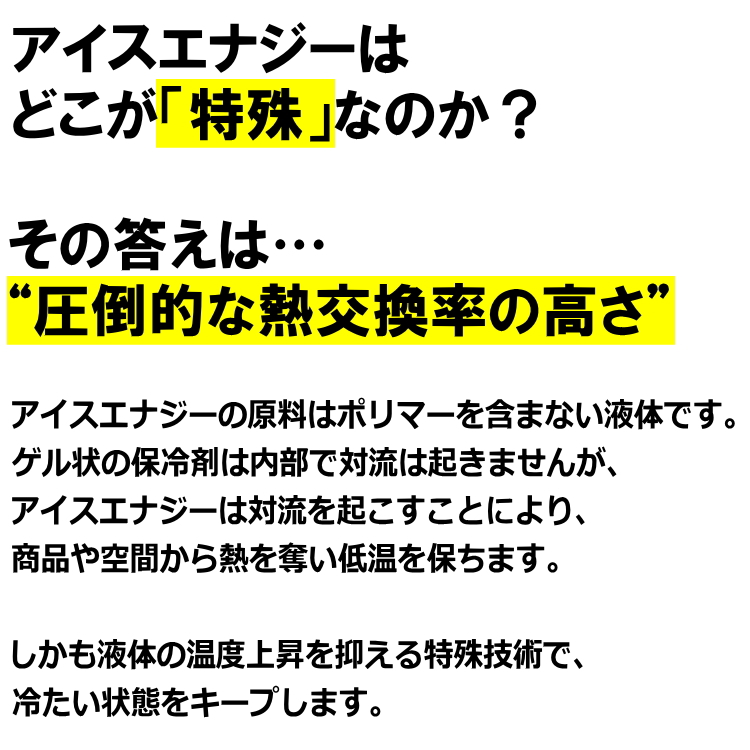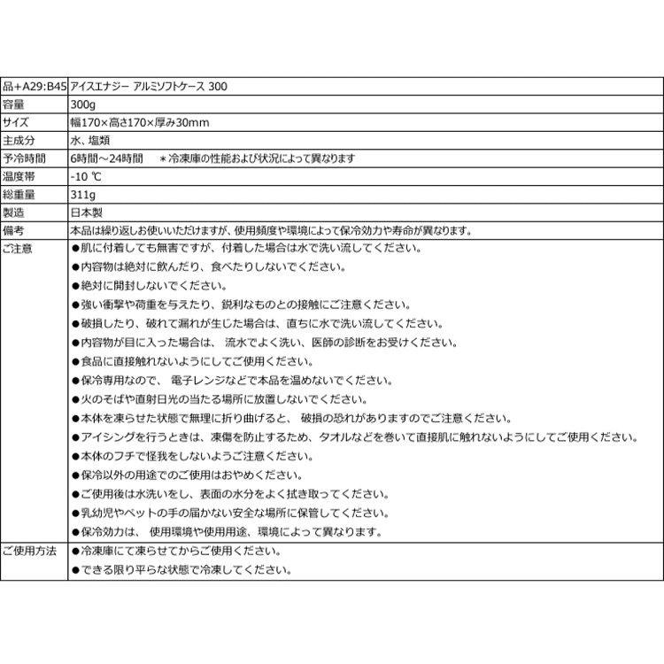 ご注文後のキャンセル・返品・交換不可 配達はポスト投函 ■ブランド:ICE ENERGY アトム技研株式会社■メーカー品番:IEASG2-10-300■商品名:アイスエナジー アルミソフトケース■容量:300g■温度帯:-10℃■サイズ:170mm×170mm×30mm■外装材:ポリエチレン(PE)、アルミ■内容物:水、塩類■生産国:日本製■使用用途:クーラーボックスや保冷バッグに入れた冷凍食品、デザート、冷たいドリンクなどの保冷■商品説明:アウトドアに!キャンプに! いつだって自分の世界観を大切にしたい、スタイリッシュなキャンパー待望の黒いコンパクトな保冷剤。デザイン性はもちろん、業務用保冷剤としてプロに信頼される保冷性能の高さもお墨付きです。より耐久性を求めるお客様からのフィードバックに応えて、外装にアルミ素材を採用。より頑丈で熱伝導率が高く、保冷機能が向上した製品に進化しました。家庭用冷凍庫で凍結させるには約24時間かかります。冷凍庫の仕様、ご利用状況で凍結までの時間は前後します。本品は繰り返しお使い頂けますが、使用頻度や環境によって保冷効力や寿命が異なります。