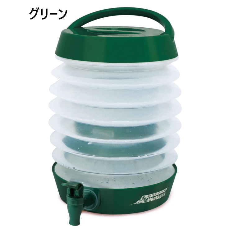 ご注文後のキャンセル・返品・交換不可 ■ブランド:Montagna モンターナ 株式会社ハック■メーカー品番:HAC4557■商品名:折りたたみ式ウォータージャグ5.5L■カラー:グリーン ネイビー■容量:5.5L■主材質:PP・シリコン■重量:約345g(本体)約465g(箱込)■サイズ:約W23×D21×H25cm(使用時)約W23×D21×H11cm(収納時)約W25×D11×H21cm(箱)■商品説明:折りたたみ式でコンパクトに持ち運びが可能。大容量5.5Lなのでファミリーや複数人でもシェアできます。コック式で簡単に注水/止水の切り替えができます。※沖縄県及び離島への配送は送料無料の対象外